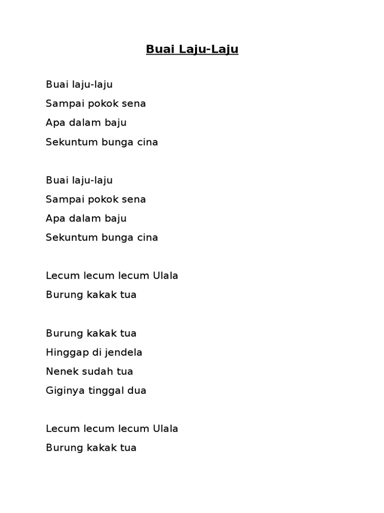 Buai Laju-Laju Buai laju-laju Sampai pokok sena Apa dalam baju Sekuntum bunga cina Buai laju-laju Sampai pokok sena Apa dalam baju Sekuntum bunga cina Lecum lecum lecum Ulala Burung kakak tua Burung kakak tua Hinggap di jendela Nenek sudah tua Giginya tinggal dua Lecum lecum lecum Ulala Burung kakak tua. Duitku beribu semua entah ke mana. Perkongsian dari Mia ketika sedang membelek koleksi lagu lama dari filem melayu dulu Bawang Putih Bawang Merah tahun 1959.